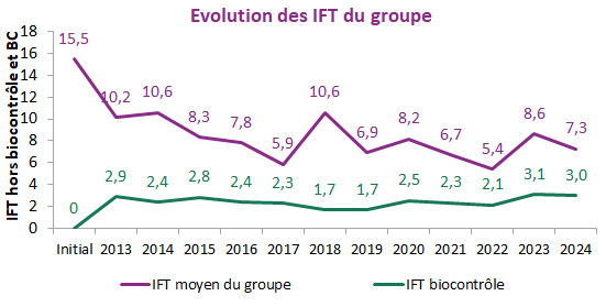 Le groupe partait d'un IFT relativement élevé et a réussi a diminuer sa consommation de produits phytosanitaires pour atteindre un IFT hors biocontrôle de 5,4 en 2022, année favorable à la baisse d'IFT. En 2023, où le printemps a été pluvieux et humide, le risque de maladies cryptogamiques était élevé, ce qui explique une remontée de l'IFT. On voit donc que l'effet "année" lié aux conditions météorologique joue un rôle important sur l'IFT. Malgré tout, l'IFT 2023, qui est un IFT représentant une année défavorable à la diminution de l'usage de produits phytopharmaceutique, est à 8.6 soit une baisse de 45% par rapport à l'état initial. Sur une année favorable comme 2022 nous avons atteint une diminution de 66% par rapport à l'état initial.