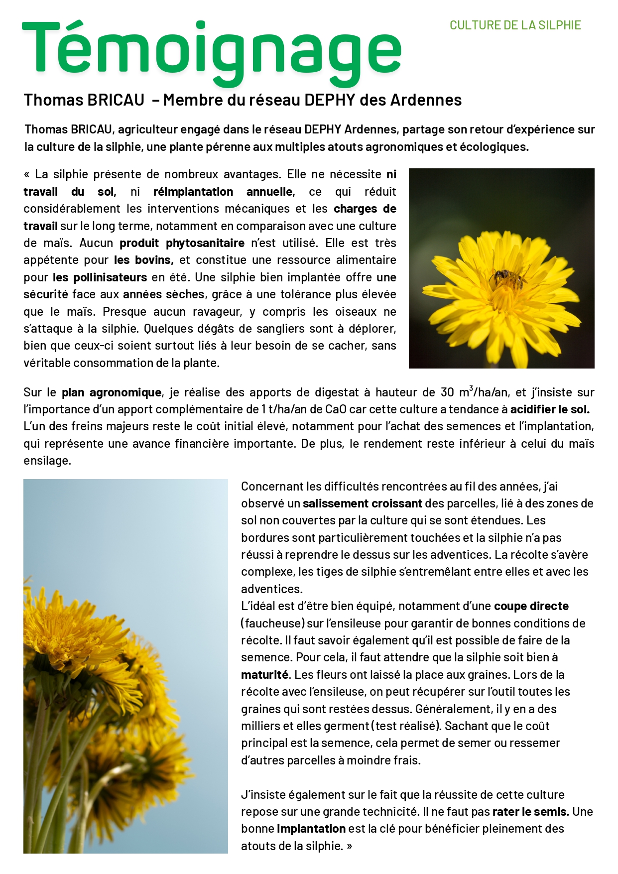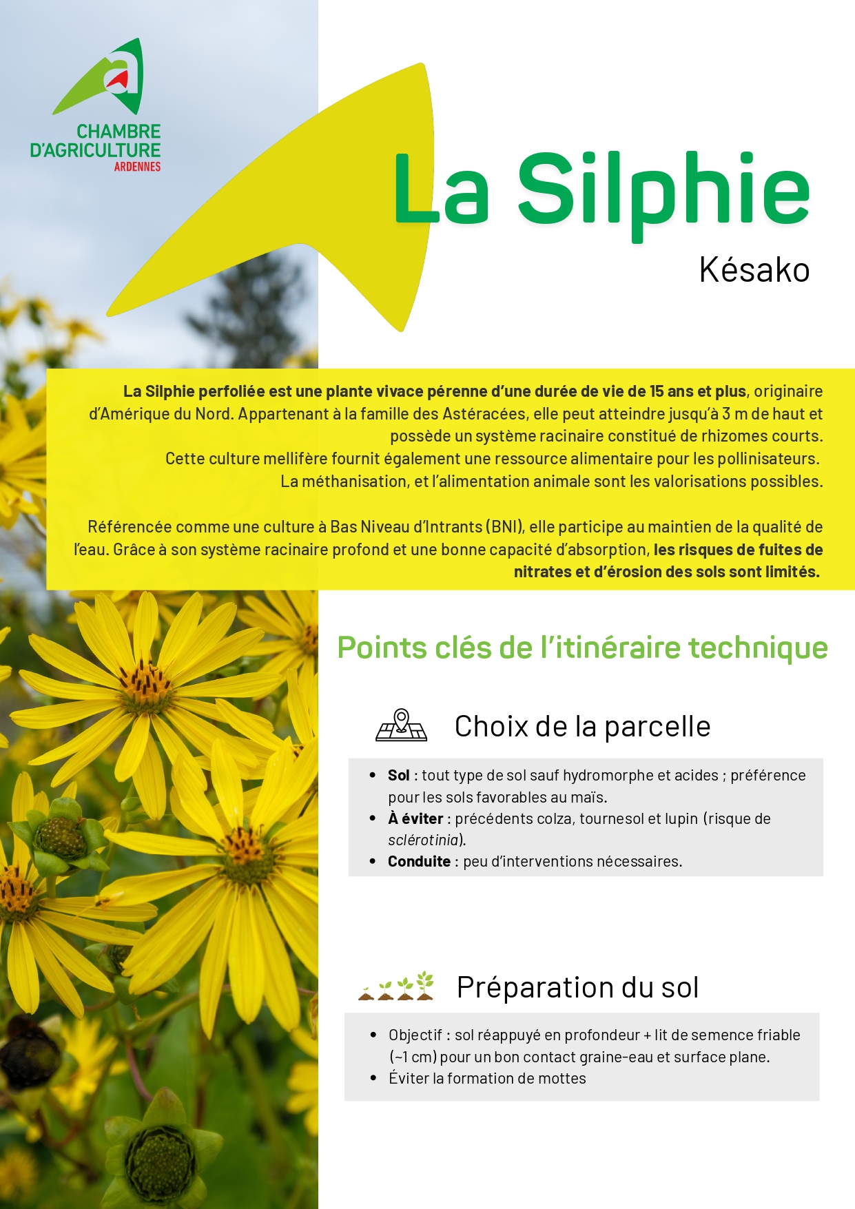 - Revoir la rotation dans certaines exploitations en favorisant les rotations 2/2 (2 cultures d'automne suivies de 2 cultures de printemps) pour mieux gérer la problématique graminées. Introduire des nouvelles cultures comme le tournesol, encore très peu présent dans les Ardennes.