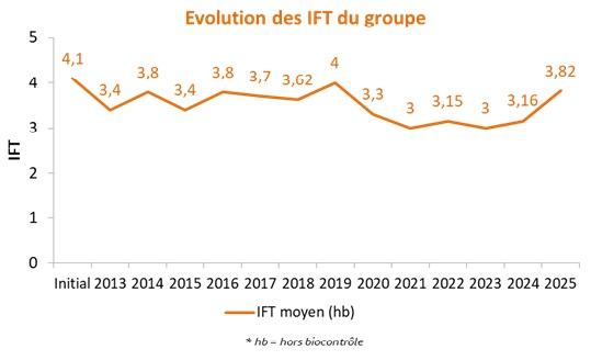 Le groupe présente de bons résultats du point de vue de la réduction des IFT hors herbicides. La suppression des régulateurs, les passages à demi-dose concernant les fongicides et insecticides, contribuent à un IFT hors herbicides contenu. La majorité des agriculteurs tentent de réduire l'IFT herbicides. Si l'élevage reste un atout de ce point de vue avec l'insertion de cultures fourragères (méteils et luzerne essentiellement), il reste un levier à efficacité limité car les surfaces fourragères restent peu importantes sur les exploitations (surfaces liées au dimensionnement restreint de l'atelier élevage, beaucoup de prairies permanentes, peu de prairies temporaires qui tournent dans la rotation).