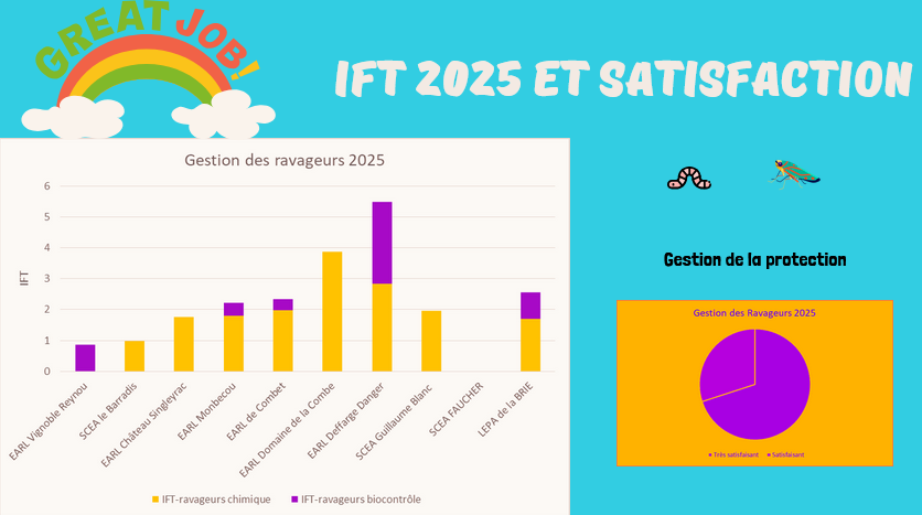 Les IFTs sont corrélés à la pression vécues dans notre vignoble, néanmoins les agriculteurs ont multiplié leurs actions de prophylaxie et de recours aux biocontroles pour une gestion optimale et une sécurisation au mieux de la récolte. Cette année a été un peu plus simple à maitriser concernant la protection phytosanitaire. Ils en découlent des IFT plus bas que les dernières années qui ont été très compliqués dû à la pression extrême du mildiou, du black rot et des tordeuses de la grappe.
